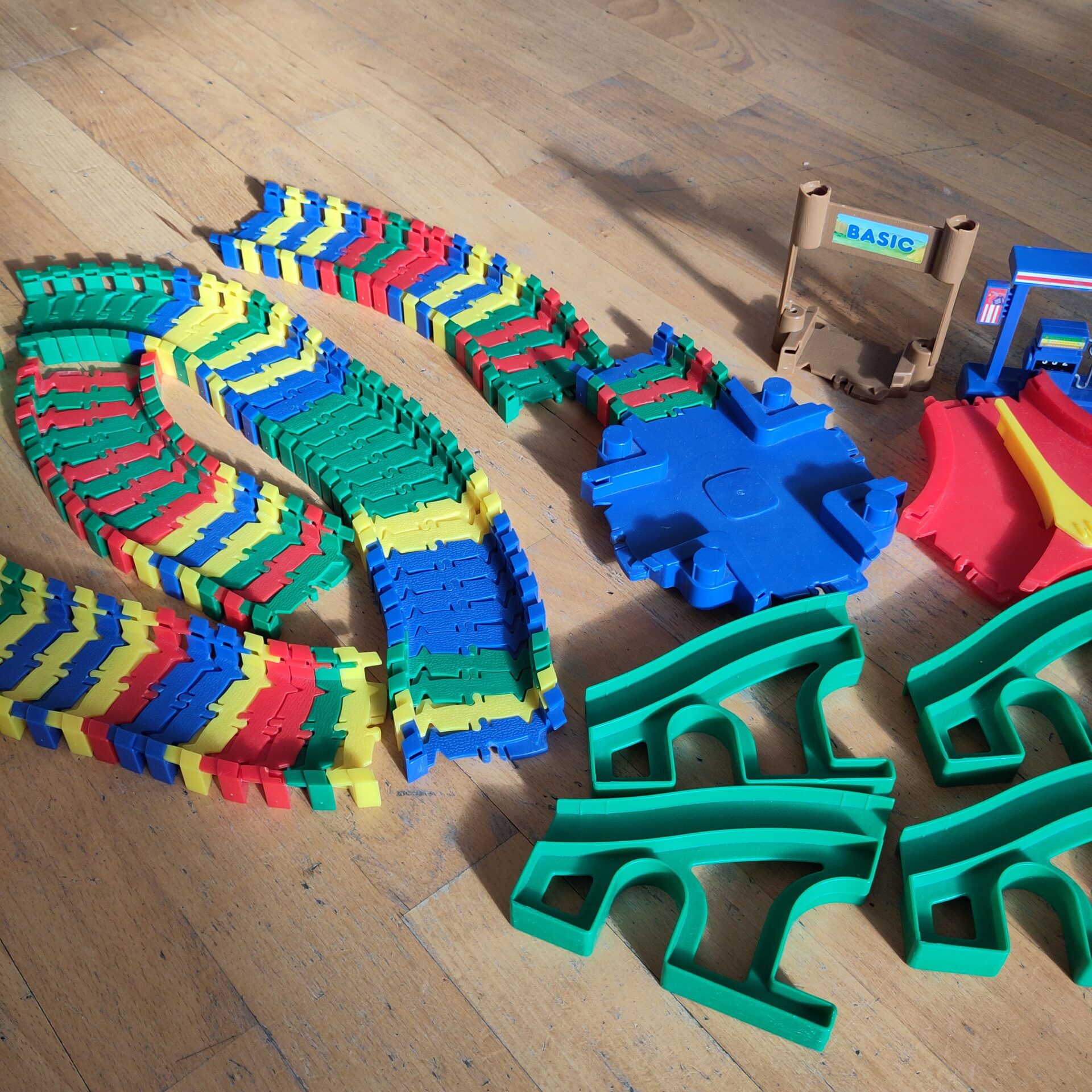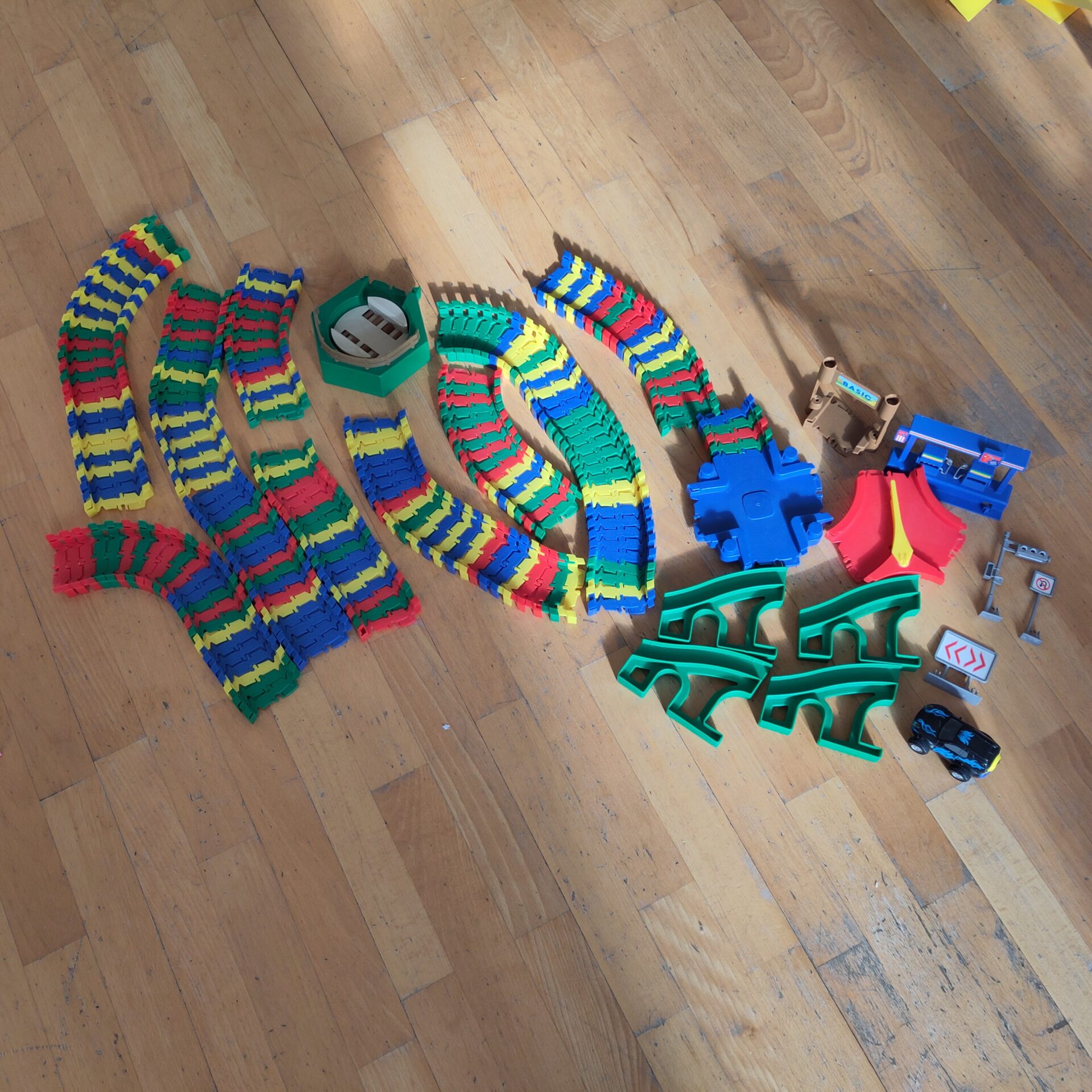 Ett set flexi trax med några tillbehör. Behöver diskas av. Bilen är seg så behöver ev kompletteras med en annan. Bör få plats i skåpet.